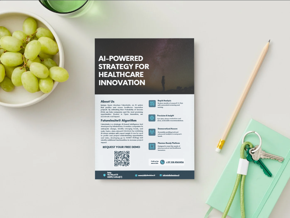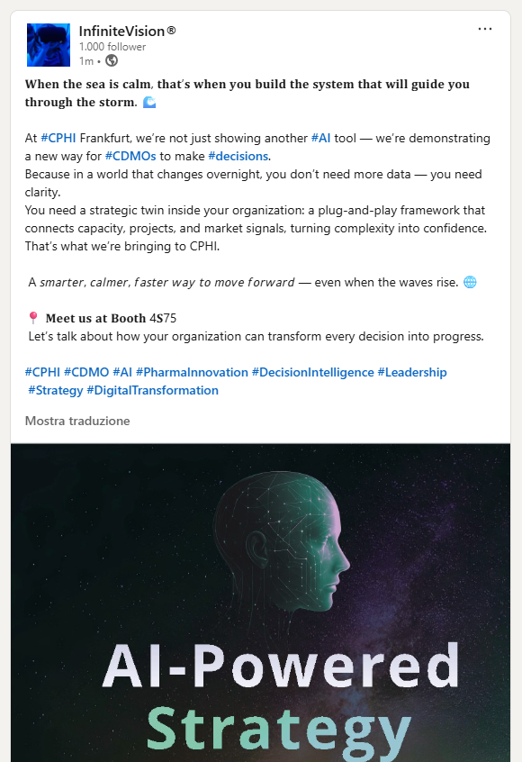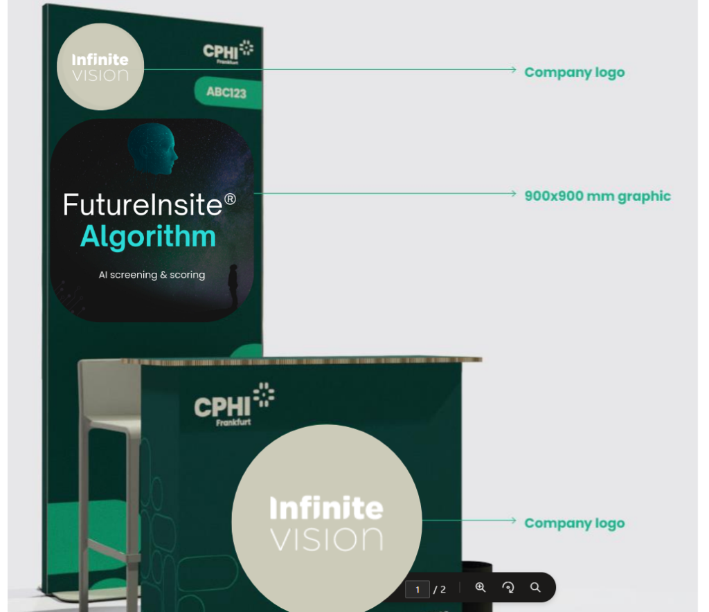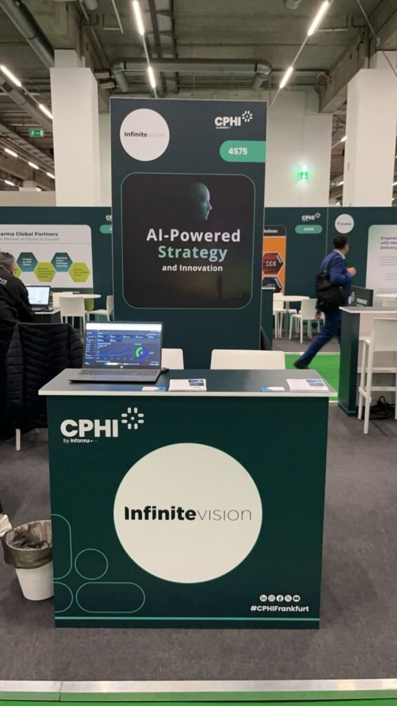 Visual per stand evento aziendale & realizzazione grafica volantini — Infinite Vision (CPHI Francoforte 2025)